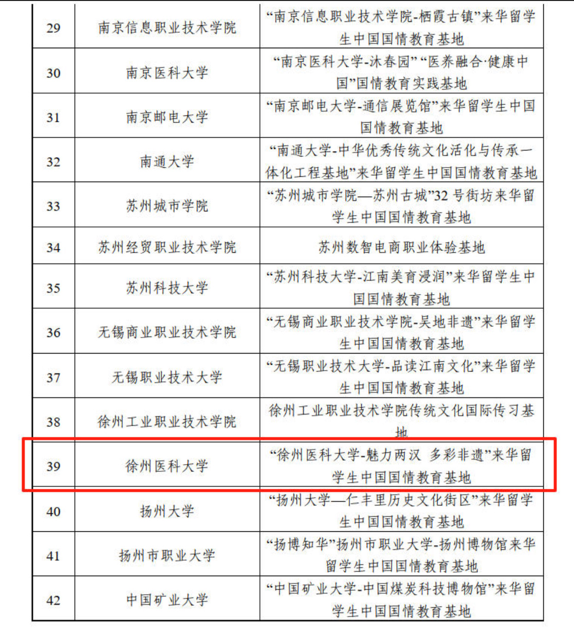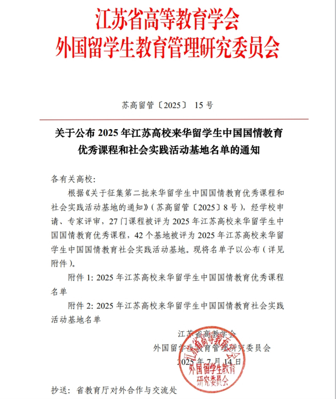 近日,江苏省高等教育学会外国留学生教育管理研究委员会发布了《关于公布2025年江苏高校来华留学生中国国情教育优秀课程和社会实践活动基地名单的通知》(苏高留管〔2025〕15号),我校国际教育学院申报的“魅力两汉 多彩非遗”来华留学生中国国情教育基地成功入选,标志着我校在留学生国情教育和社会实践方面取得新突破。