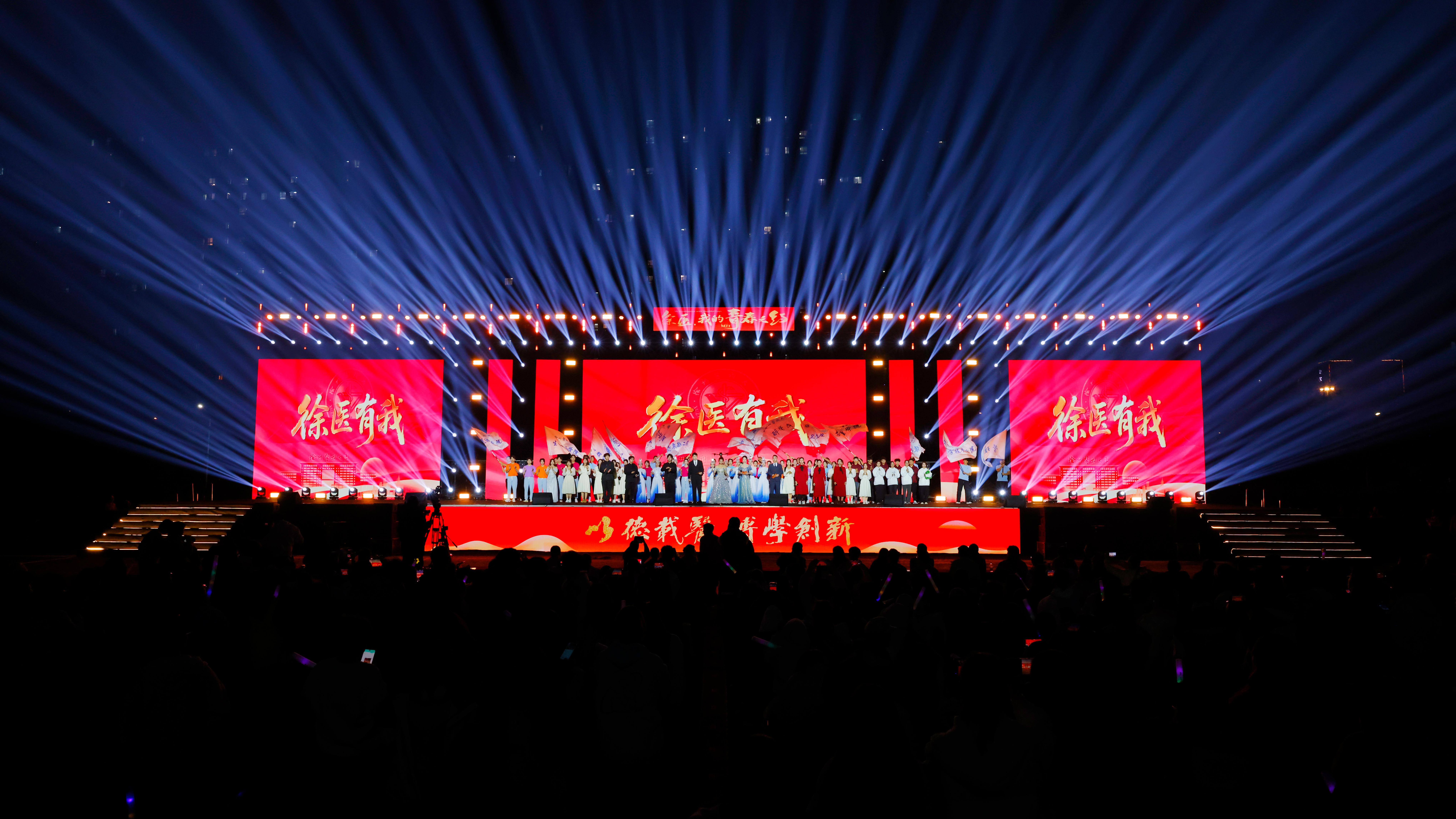 晚会在酷炫的灯光秀与开场视频中拉开帷幕,大学生艺术团的舞蹈《追光》点燃全场热情;情景剧《真理之歌》再现了烽火岁月中,革命先驱将闪耀的信仰化作前行的火炬,引领全国人民为民族存亡挺身而出、向光而行;在节目《青春征程》中,三位优秀的徐医青年讲述了他们将“以德载医、博学创新”的校训精神融入实践的奋斗故事;歌曲《世界赠与我的》以温暖清澈的歌声,传递出徐医大家庭的深切温情与包容;新生秀《散装江苏,整装徐医》生动展示了徐医青年团结一心、共筑梦想的青春风采。留学生带来的舞蹈《非同凡响Dynamite》以充满异域风情的酷炫舞步点燃全场,展现了文化交融的无限魅力。徐州幼儿师范高等专科学校的学生们还带来了苏超赛场上的热舞《奔向前方》,现场观众掌声与欢呼声不绝于耳。相声《徐医之最》幽默盘点校园生活的独特趣味;歌曲串烧《跃动的节拍》用一串串熟悉的旋律,串起共同的青春记忆;朗诵《仁心启航》将“健康所系、性命相托”的庄严誓言融入字里行间;辅导员的节目《我爱你中国》唱响了他们心中的家国情怀;舞蹈《接力》艺术化地呈现了徐医精神薪火相传的动人历程。最后,整场晚会在歌曲《有我》中落下帷幕,歌声嘹亮而坚定,展现了徐医青年在学校朝着建设特色鲜明、国内一流的高水平医科大学目标奋勇前进的征程中,豪情满怀、壮志在心的责任与担当。