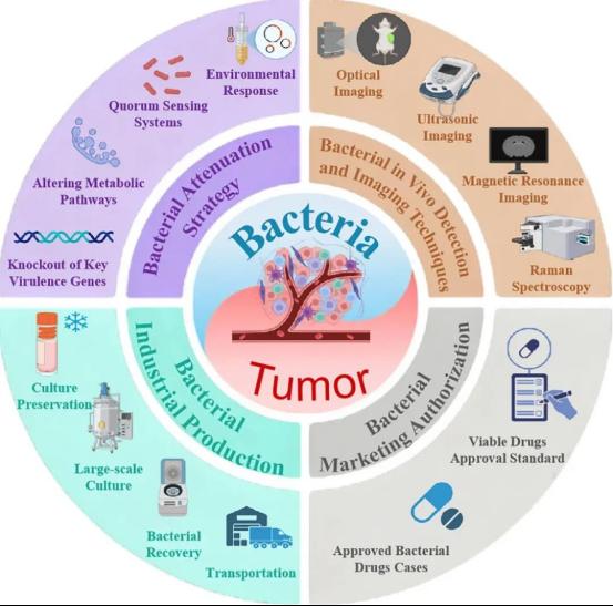 基于减毒细菌的肿瘤治疗,核心在于利用基因编辑技术实现减毒细菌的肿瘤靶向定植,通过溶瘤效应与免疫微环境重塑发挥协同抗肿瘤作用。然而,该技术在迈向临床转化时,面临安全性风险、体内监测困难、规模化质控复杂及监管标准缺失等多重挑战,制约了其临床应用进程。针对以上挑战,该综述系统梳理了该领域四大核心内容:临床应用安全风险与减毒策略、细菌体内成像技术、生产工艺优化及目前市场审批路径。其中文章针对CAR-T治疗实体瘤面临的多重挑战,探讨了减毒细菌与CAR-T细胞治疗实体瘤之间的协同联系。文章提出了“设计-监测-调控”的系统框架。该框架将基因回路介导的细菌行为调控与多模态活体成像技术整合,监测细菌在体内的分布,克服细菌治疗效果不稳定以及工业化生产控制困难等缺陷,为推进减毒细菌疗法的临床转化提供了系统的解决方案。